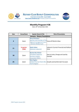 Agenda for the Month of January 2022